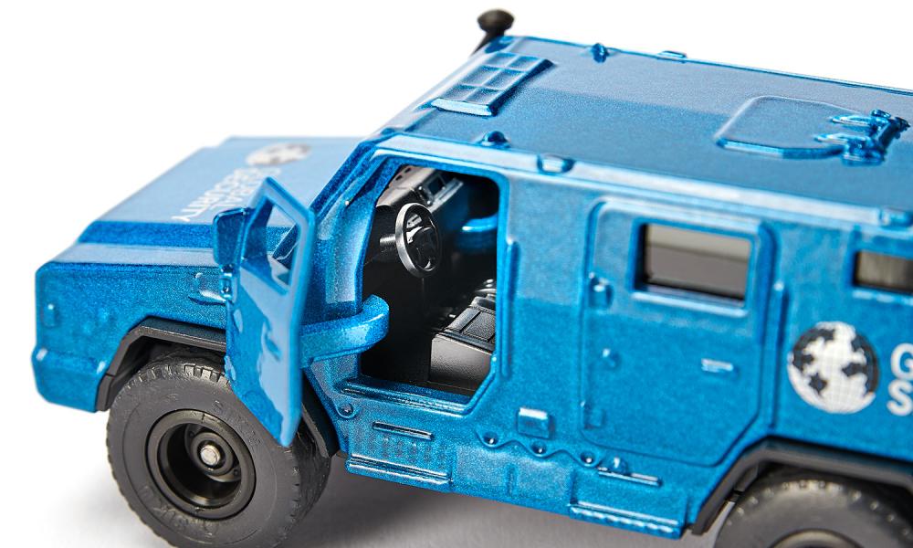 Der Geldtransporter von siku kommt unauffällig in metallic blau daher, die Seitenflächen sind mit dem Logo „Global Security“ versehen.