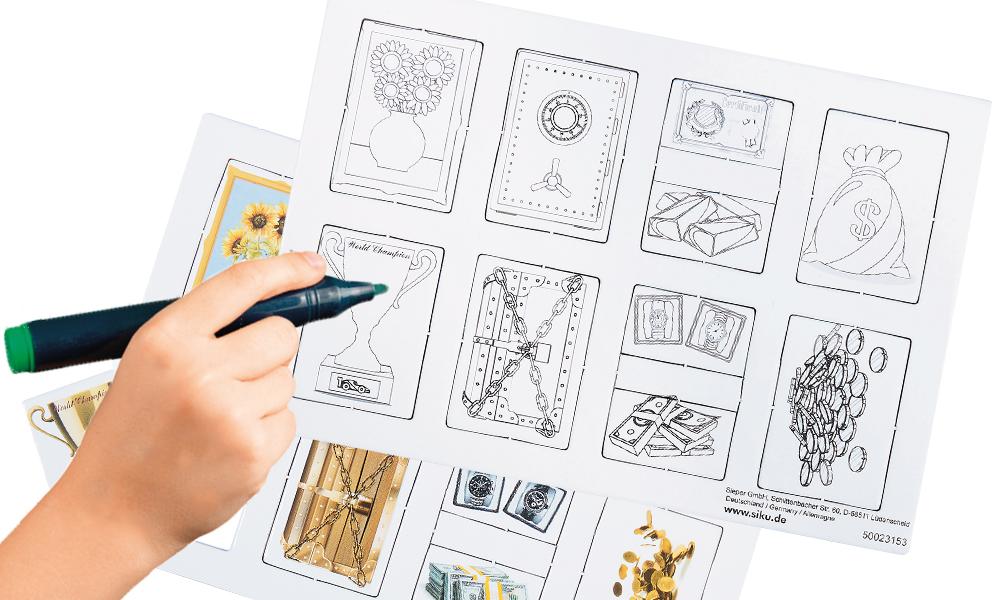 Besonderer Clou: Ein Pappbogen ist fertig bedruckt, beim zweiten sind nur die Konturen abgebildet, so dass die einzelnen Elemente selbst ausgemalt und kreativ gestaltet werden können.
