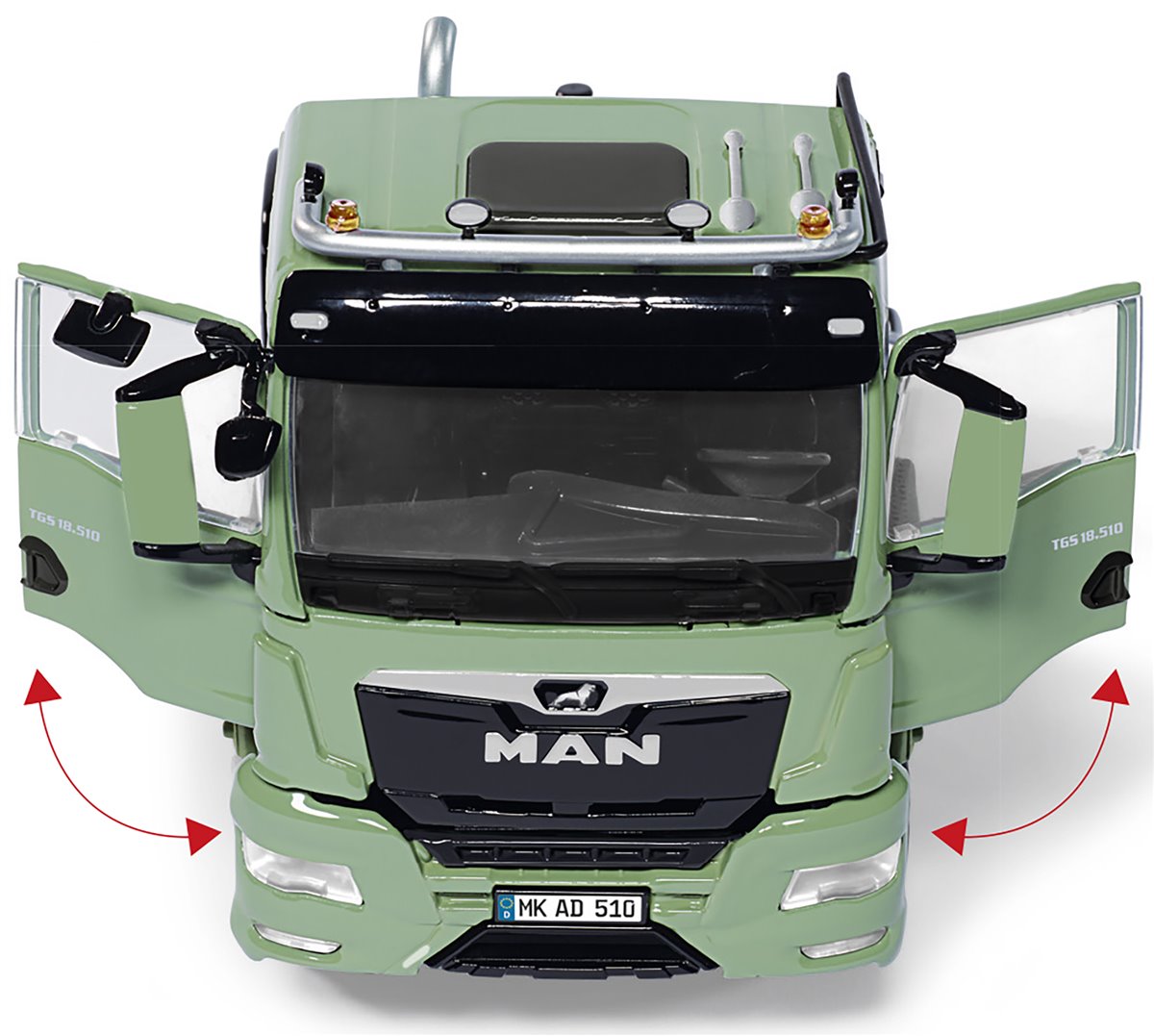 Präzisionsmodellbau jetzt auch im Lkw-Bau – die 1:32-Premiere startet mit der neuesten MAN-Generation. Die Traditionsmodellbauer von WIKING stellen erstmals ein Lkw-Modell in 32-facher Miniaturisierung vor, mit dessen Realisierung die Modellbauer ihrer Philosophie und ihren Ambitionen im landwirtschaftlichen Maßstab gerecht werden. Es sind hierbei die kleinen Details, die bei WIKING immer wieder Spaß bereiten: So findet sich der neue MAN TGS 18.510 4x4 zum Debüt im gleichen Lack wieder wie einst die „Ackerdiesel“ unterwegs waren – eine Reminiszenz an die früheren MAN-Schlepper der 1950er-Jahre! Und auch das Kennzeichen „MK-AD 510“ kürzelt in der Mitte freilich etwas versteckt, aber mit einem Augenzwinkern die Ackerdiesel-Verwandtschaft. Vorbild ist der topaktuelle MAN TGS 18.510 4x4 Euro 6d. Gerade diese Zugmaschine, die zur Premiere in der Ausführung mit permanentem Allradantrieb miniaturisiert wird, schlägt eine Brücke zum Thema Landwirtschaft. Dort finden auch die Vorbilder dieser Gespanne ihren Alltagseinsatz, weil sie dort immer häufiger zwischen Feld, Straße und Weiterverarbeitung hin- und herpendeln. Dabei überzeugen sie mit der gewünschten hohen Nutzlast, sind auf dem Feld aber zugleich traktionsstark unterwegs. Imposanter Auftritt durch das höher gelegte Fahrgestell WIKING stellt die zweiachsige Solo-Zugmaschine bereits in der feinsten Detaillierung und Dekorierung vor.