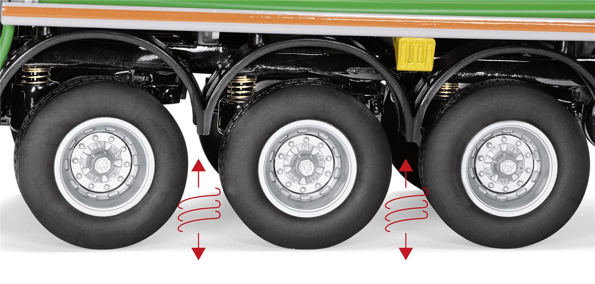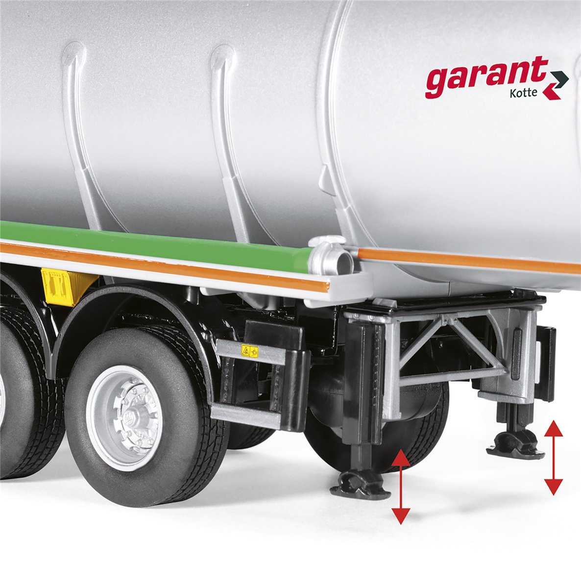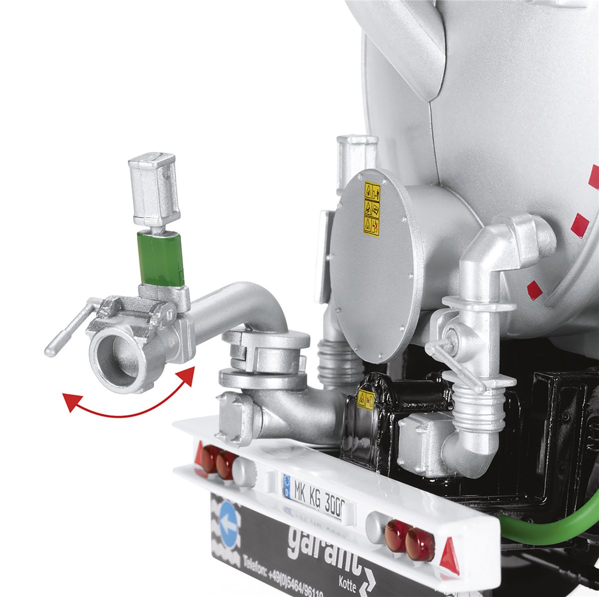 Das 1:32-Modell entsteht in Handarbeit, zahlreiche Bauteile aus Zinkdruckguss und Kunststoff werden präzisionsgenau zusammengefügt. Im abgekoppelten Zustand kann der Tanksattelauflieger mühelos auf die ausziehbaren Stützen gestellt werden, sodass eine vorbildgerechte Alltagspräsentation möglich ist. Heckseitig können überdies die Kupplungsarmaturen zum Ablassen praxisgerecht geschwenkt werden. Genauso gut lässt sich das Bedienpult öffnen und wieder verschließen. Um die vorbildgerechte Wendigkeit herzustellen, ist die Hinterachse lenkbar angelegt, die Achsen sind gefedert und die Funktion der Lift-Achse lässt sich nachvollziehen.
