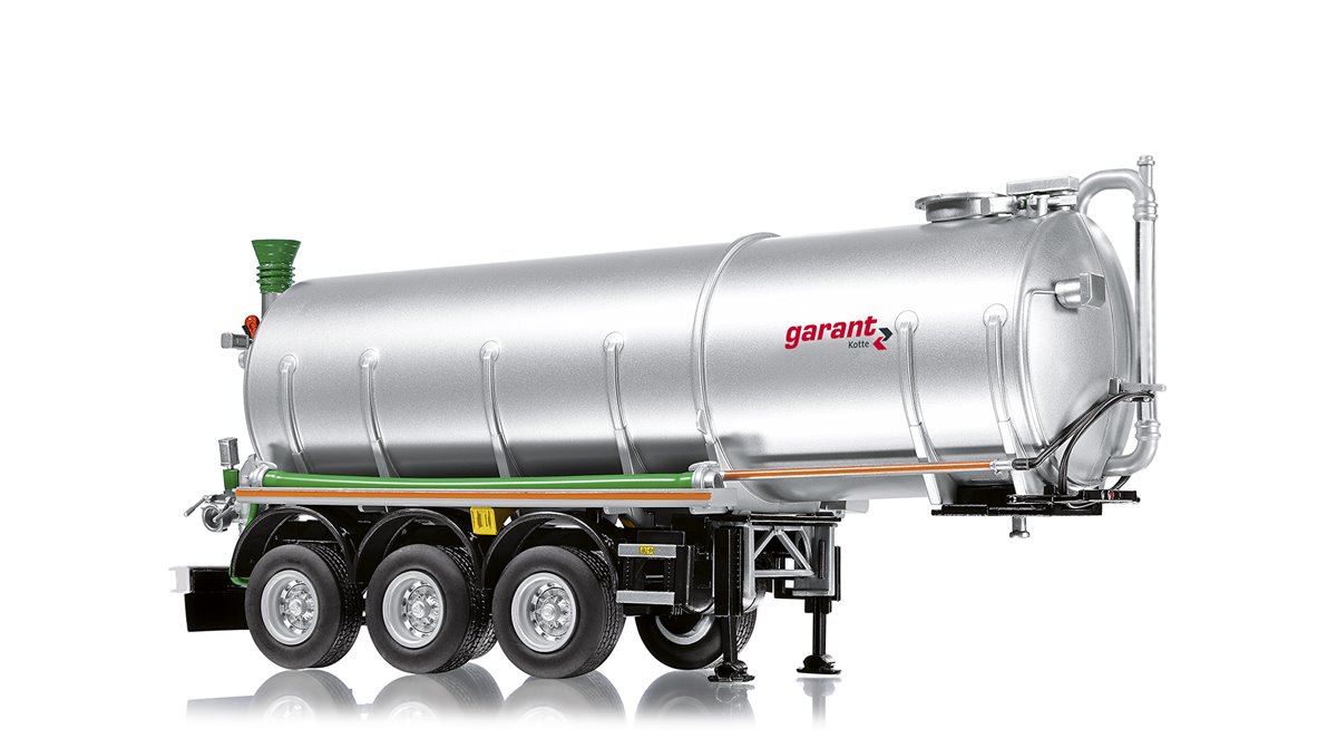 Gerade in den letzten Jahren gehören Tanksattelauflieger angesichts der spezialisierten Betriebe bei gleichzeitig gewachsener Betriebsgröße zum Alltag in der Landwirtschaft. Mit dem Kotte garant Tanksattelauflieger TSA 30.000 transportieren Lohnunternehmen anfallenden Wirtschaftsdünger besonders auf längeren Strecken zügig und kostengünstig. Durch die kompakte Bauweise des Tankaufliegers, den WIKING 32-fach mit schwarzem Fahrgestell und mit gleichzeitig schwarzem Tank miniaturisiert, eignet er sich vorbildgerecht für ein Gespann mit dem authentischen MAN TGS 18.510 4x4. Der Landmaschinenhersteller Kotte aus dem niedersächsischen Rieste erreicht mit dem TSA der Garant-Baureihe hohe Einsatzsicherheit und schafft zugleich eine hochwertige, maßgeschneiderte Ausstattung für effiziente und wirtschaftliche Arbeitsabläufe. Die Stützlastübertragung vom Vorderwagen auf die Zugmaschine ermöglicht in Kombination mit der Luftfederung ein zulässiges Gesamtgewicht von rund 34 Tonnen. Da der Vakuumkompressor mit der patentierten Drehdurchführung mechanisch angetrieben wird, steht für die Befüllhilfe die komplette hydraulische Leistung der Zugmaschine zur Verfügung. Der Andocktrichter an der Rückwand ist so positioniert, dass das Ausbringfahrzeug die Gülle effizient überladen kann. Ein Pumpensumpf sorgt für eine vollständige Entleerung des Behälters. Rückwärtige Hinterachse lenkt vorbildgerecht mit