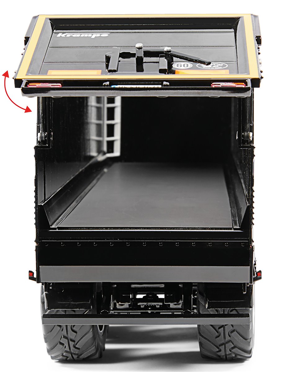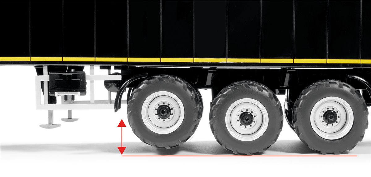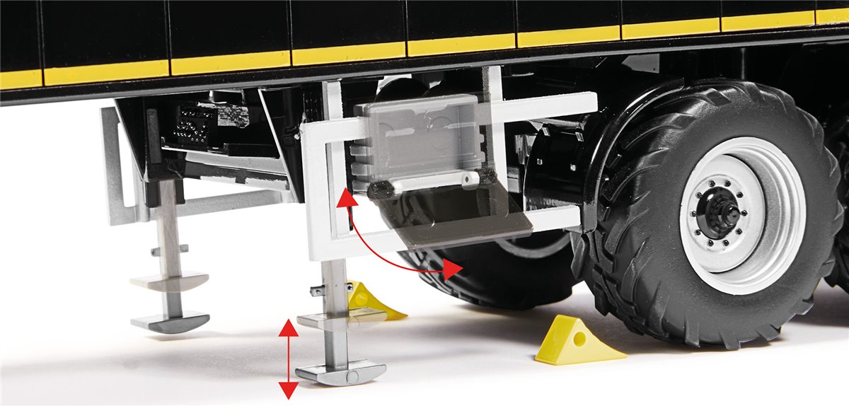 Alle Funktionen maßstabsgerecht simulierbar Selbstverständlich kann die heckseitige Klappe vollständig nach oben bewegt werden, sodass ein müheloses Abladen der Fracht möglich wird. An der geschlossenen Mulde lässt sich heckseitig mit einer Hebelbewegung die Entladeöffnung zur besseren Dosierung von feinem Schüttgut freigeben. Überdies sind die Stützen im vorderen Bereich des Aufliegers variabel herausfahrbar, sodass der Auflieger auch abgekoppelt einen festen vorbildgerechten Stand erreicht.