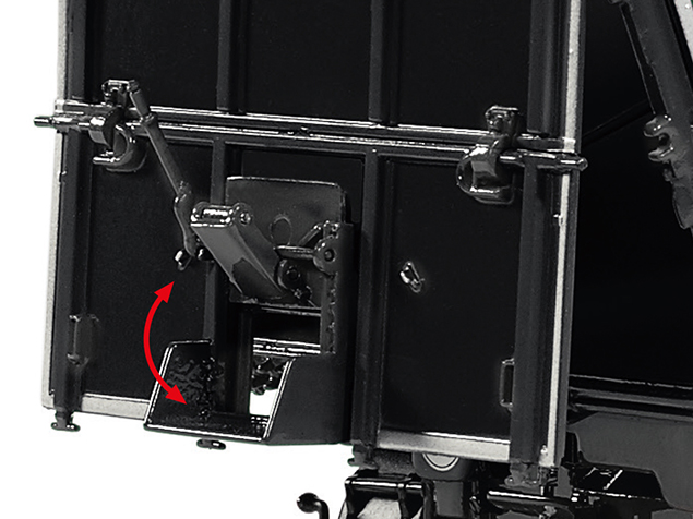 Die Authentizität des Vorbilds hat WIKING auch in den Maßstab 1:32 transferiert. Das Fahrgestell mit Drehschemel und Deichsel ist aus Zink gehalten. Während die Pritsche mit ihren Bordwänden in authentischer Gestaltung erscheint, macht die filigrane Markenbedruckung den Originalauftritt komplett. Die Bereifung erfolgt mit typischem Straßenprofil, die Felgen hat WIKING ganz nach dem Kröger-Vorbild originalgetreu verkleinert. Die Blattfedern der Achsen simulieren die realistische Federfunktion. Der Hubzylinder verfügt über volle Teleskopier- und Schwenkbarkeit. Filigran nachgebildet ist das vordere Anhängerpodest. Die heckseitige Stoßstange erscheint aus Metall und komplettiert den detailfeinen Auftritt durch eine mittig eingebaute Anhängerkupplung mit typischer Zugmauloptik. Die hintere Anhängerbeleuchtung besteht ebenso aus Kunststoff wie die Kotflügel.