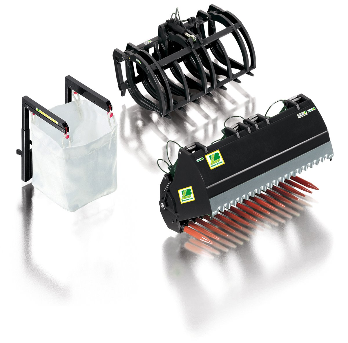 Das Set B enthält zur Frontladerbestückung außerdem Silageschneidezange und Reisiggabel. Die Silageschneidezange eignet sich im landwirtschaftlichen Bereich als verlässliches Anbaugerät zum sauberen Entnehmen von Silage jeglicher Art. Die Reisiggabel verfügt über eine vollbewegliche Mechanik, die die Oberzange und die vier Zinken auseinanderspreizen lässt.