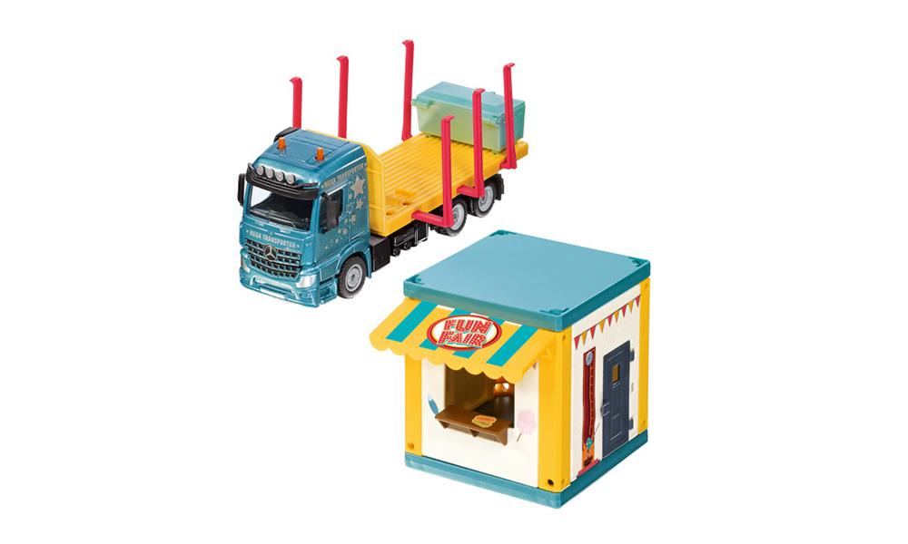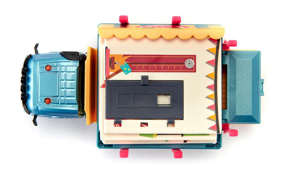 Wow, das Haus kommt auf einem Lastwagen angefahren! Wände, Dach und Markise werden auf der Spezialpritsche transportiert. Die enthaltenen Warnbaken aufstellen und los geht der Aufbau. Das Haus kann mit den Aufklebern individuell gestaltet werden und lässt sich aufgebaut auf der Pritsche transportieren.