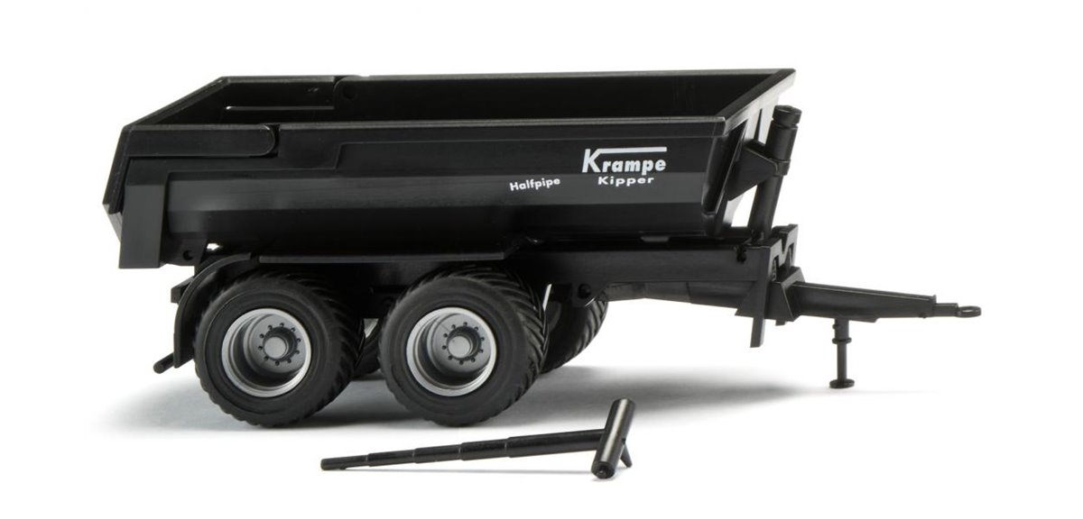 Mulde schwarz. Fahrgestell, Deichsel, Standfuß schwarz, Silberne Felgen, schwarze Kotflügel. Weiße Typenbedruckung „Krampe Kipper Halfpipe“.
