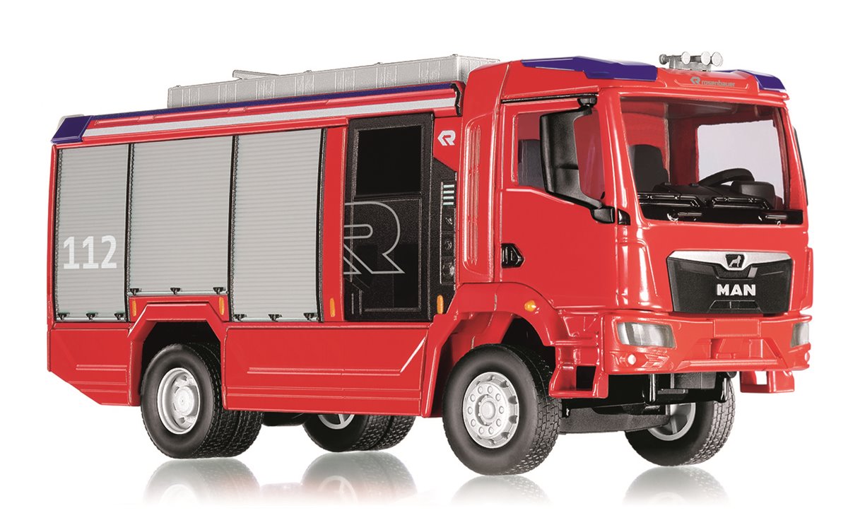 Mit dem Rosenbauer-Einsatzfahrzeug stellt WIKING ein maßstabsgetreues 1:43-Fahrzeug vor, das genauso wie sein Vorbild als kompaktes und ebenso wendiges Hilfeleistungslöschfahrzeug erscheint. Die „AT“-Baureihe erscheint im Maßstab 1:43 auf MAN TGM-Fahrgestell und erfreut sich sorgfältigster Bedruckung. Besonders augenfällig: Die von Rosenbauer optional angebotenen Glastüren für den hinteren Kabineneinstieg sind beim Modell ebenfalls transparent gehalten und geben den Blick für den Betrachter frei – bei der Kabine wird das Innere angedeutet. Das Rosenbauer-Logo prangt als Silhouette auf der Tür. Das Modell mit hoher Wertanmutung besteht aus lackierten Zinkdruckgussbauteilen, die mit Kunststoffelementen kombiniert und per Filigranbedruckung authentisch nachgebildet sind.