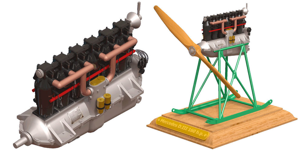 Bausatz für ein Ausstellungsmodell Flugzeugmotor mit Propeller. Inklusive Fotoätzsatz, Ständer und Sockelplatte.