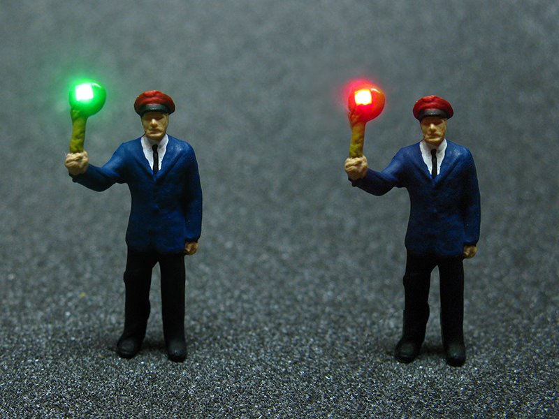 Sie erhalten eine Schaffnerfigur mit einer beleuchteten Kelle, die Sie wahlweise rot oder grün leuchten lassen können. Die Verkabelung zur LED ist fast unsichtbar verbaut und wurde in mühevoller Handarbeit übermalt.