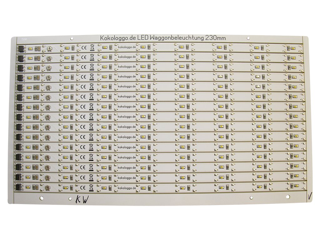 Die Waggonbeleuchtung kann in den freien unbestückten Bereichen zwischen den Pufferkondensatoranschlüssen + - getrennt werden. Die Reststücke können über die Anschlüsse + - z. B. als Hausbeleuchtung weiterverwendet werden.