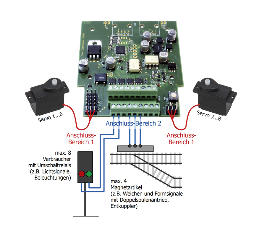 - Ansteuerung von Servos, z.B. in Weichen, Flügelsignalen, Schranken oder Toren.